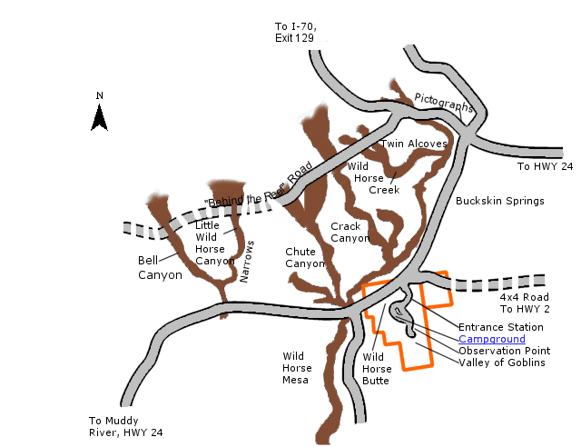 Il se situe à l'Ouest de l'UT24, d'où part une route, la Temple Mountain Road. Au bout de 5 miles, prendre à gauche sur la Goblin Valley Road, qui mène, au bout de 6.4 miles, jusqu'à l'entrée du parc.